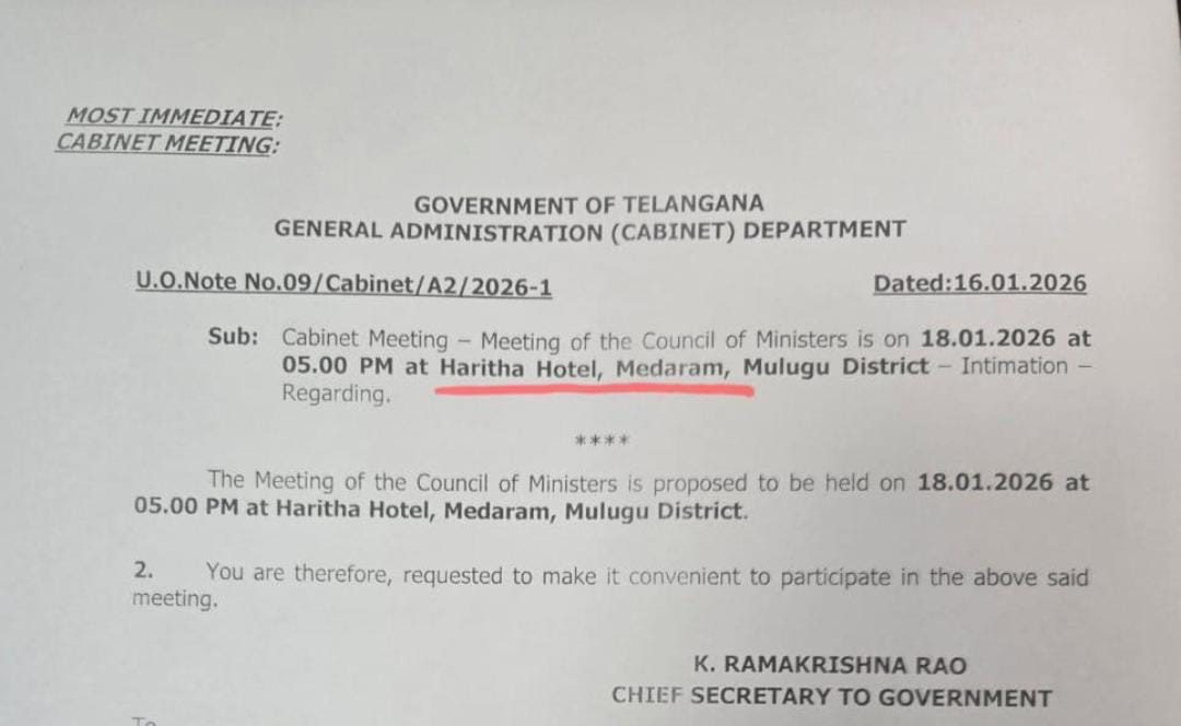 తెలంగాణ రాష్ట్ర చరిత్రలో ఓ మైలురాయి! ఇప్పటివరకు హైదరాబాద్లోని సచివాలయంలోనే జరిగే మంత్రివర్గ సమావేశాలు ఈసారి తొలిసారిగా రాష్ట్రంలోని గిరిజన ప్రాంతంలో నిర్వహించబోతున్నాయి. ములుగు జిల్లాలోని మేడారంలోని హరిత హోటల్ వేదికగా జనవరి 18, 2026న సాయంత్రం 5 గంటలకు తెలంగాణ మంత్రివర్గ సమావేశం జరగనుంది.
