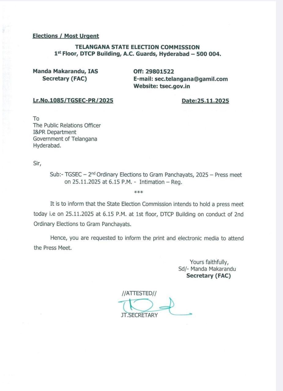 ఈరోజు సాయంత్రం 6 గంటలకు సర్పంచ్ ఎన్నికల నోటిఫికేషన్ విడుదల చేయనున్న తెలంగాణ రాష్ట్ర ఎన్నికల కమిషనర్