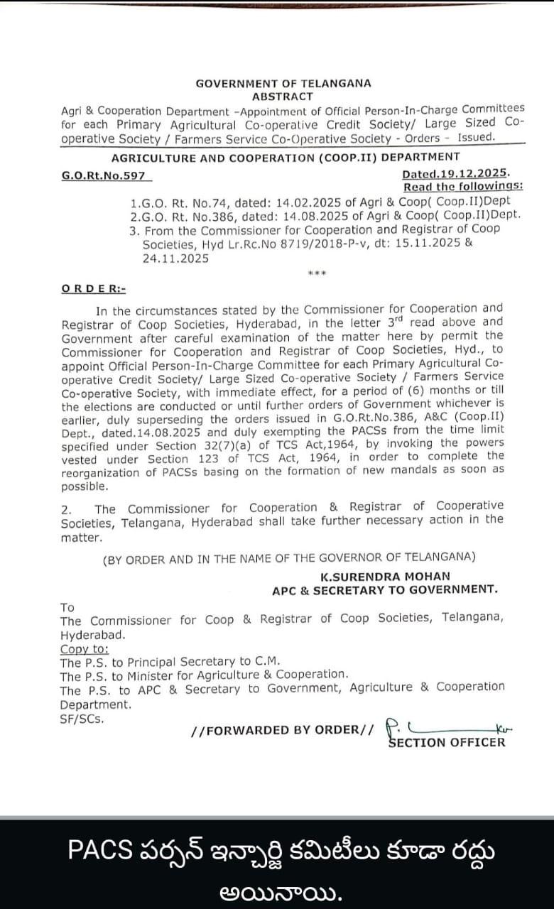 PACS పాలక వర్గాలు రద్దు చేస్తూ ఉత్తర్వులు జారీ చేసిన ప్రభుత్వం..