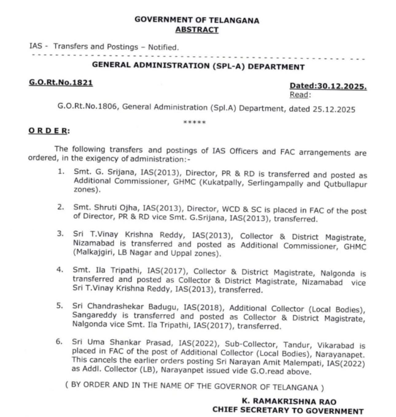 నల్గొండ కలెక్టర్ మరియు జిల్లా మేజిస్ట్రేట్గా ఇలా త్రిపాటిని నియమించారు.