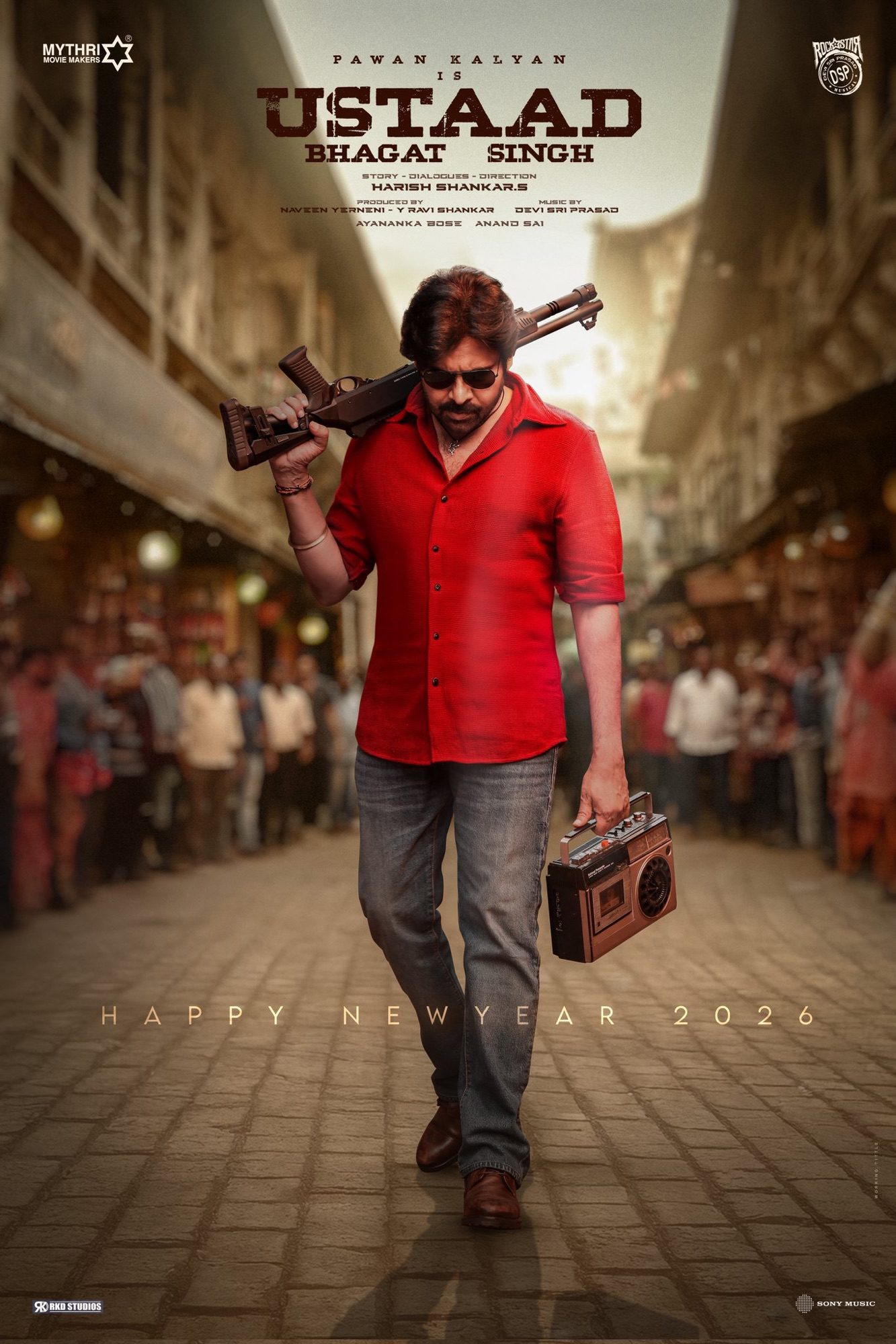పవన్ కల్యాణ్ నటిస్తున్న ‘ఉస్తాద్ భగత్ సింగ్’ సినిమా న్యూ ఇయర్ పోస్టర్ ఫ్యాన్స్ మధ్య సెన్సేషన్ సృష్టించింది. ఈ పోస్టర్లో పవన్ రెడ్ షర్ట్, డెనిమ్ ప్యాంట్లో గన్, రేడియో పట్టుకుని స్వాగ్ ఓడిపోయి నిలబడ్డాడు. సమ్మర్ 2026 రిలీజ్ కాన్ఫర్మ్ చేస్తూ మేకర్స్ హ్యాపీ న్యూ ఇయర్ విషెస్ తెప్పించారు.